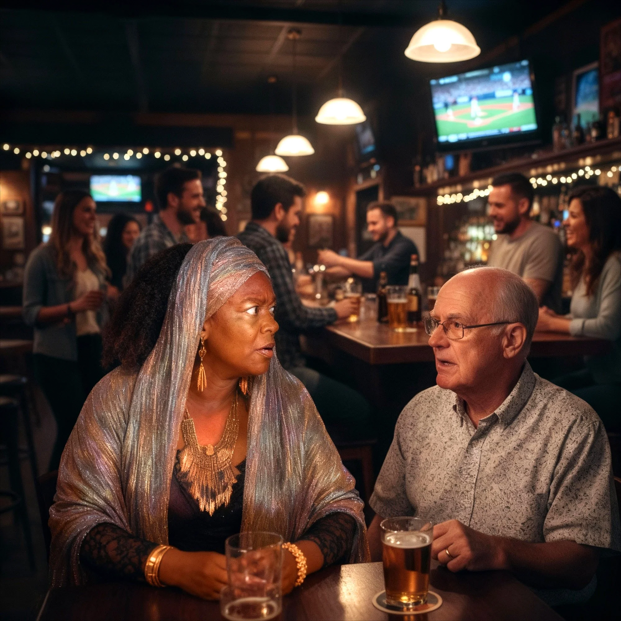 Cut to — Madame Zella in the stands, arms crossed, binoculars raised like she’s aiming faith itself.