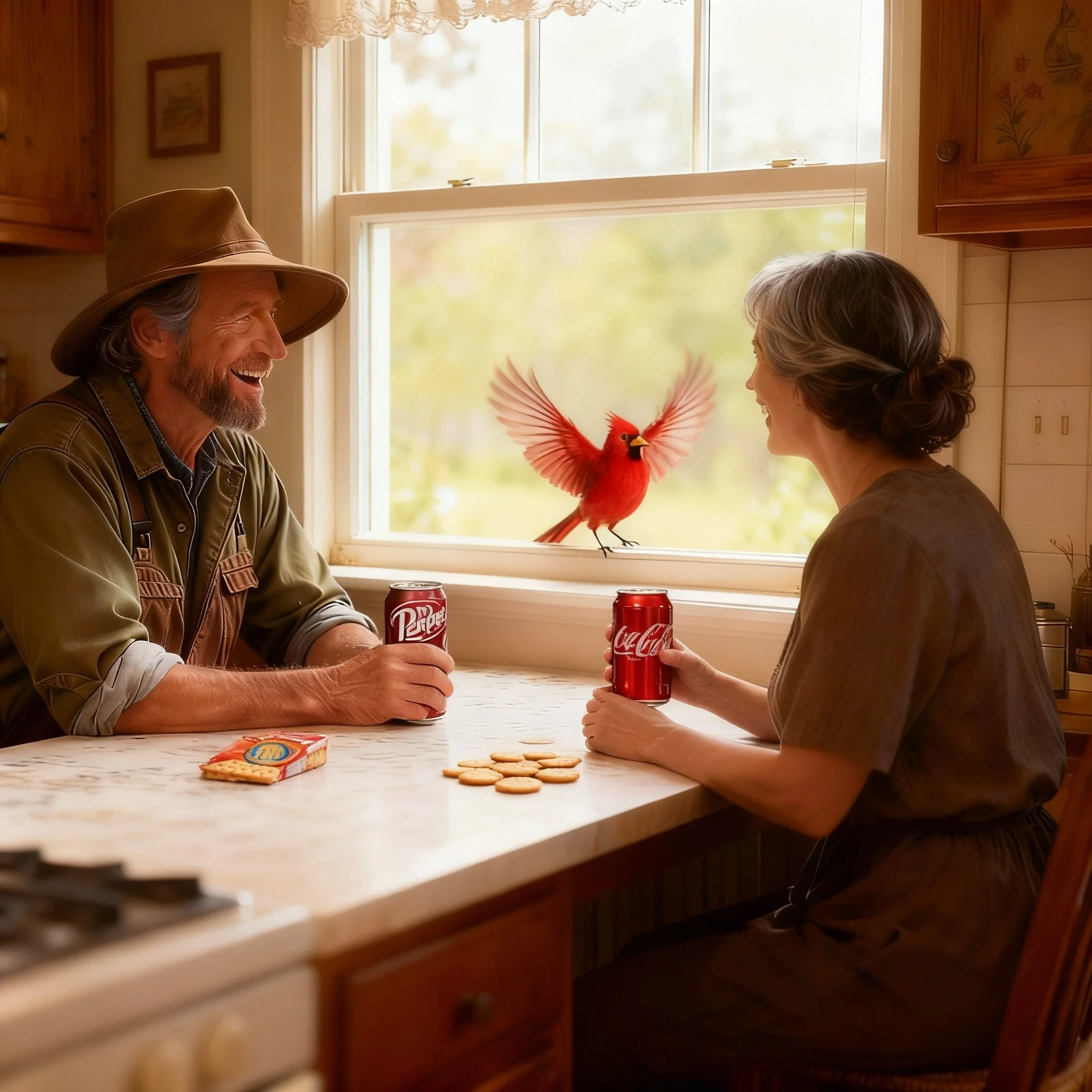 They sip coffee in unison as the cardinal circles and hits again.