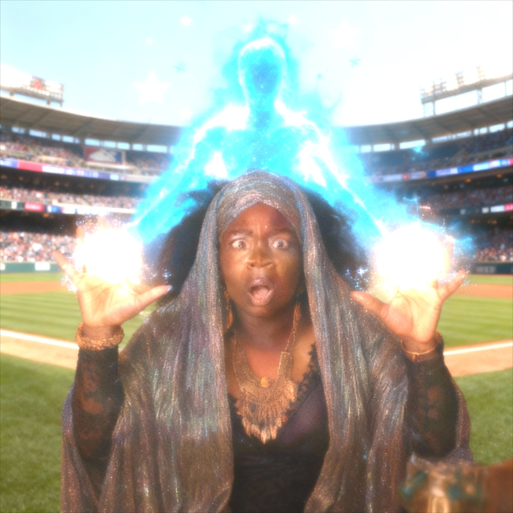 Montage — slow-mo crowd shots, crack of a bat, scarf swirling in the stands.