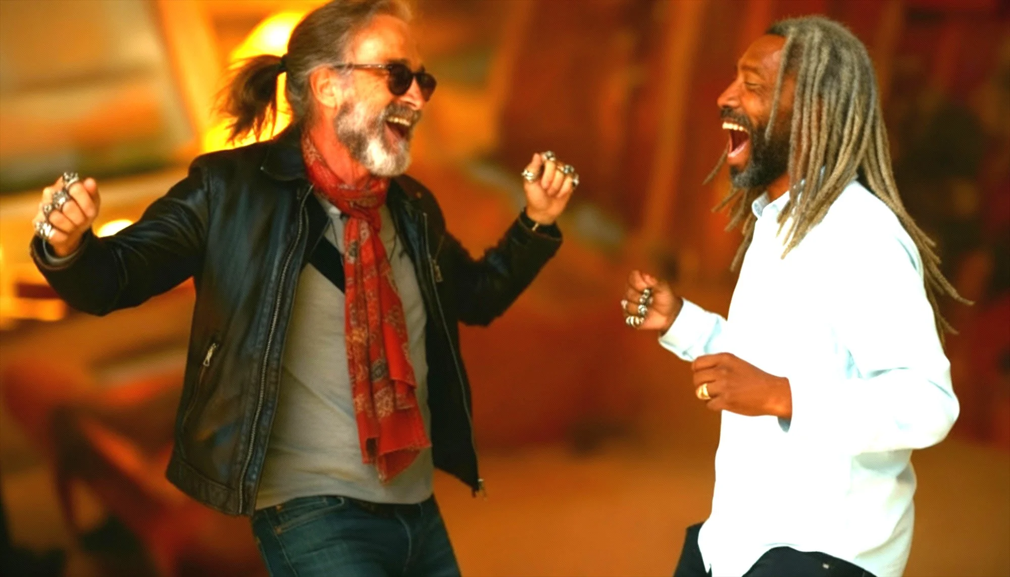 [They high-five. Cue laughter. Freeze-frame style moment.]