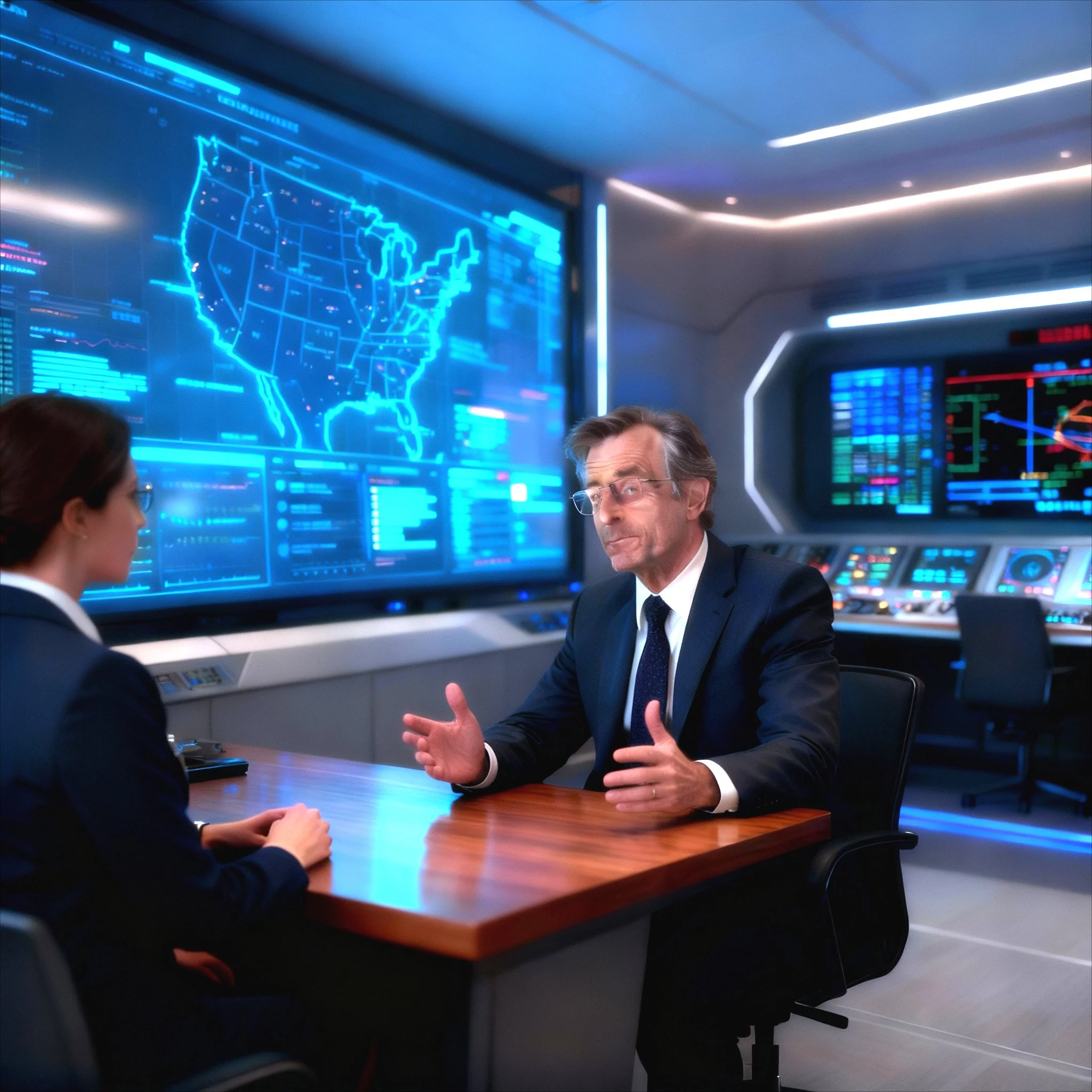 watches the feeds alone. Dim lights. Stillness. His analyst rushes in.