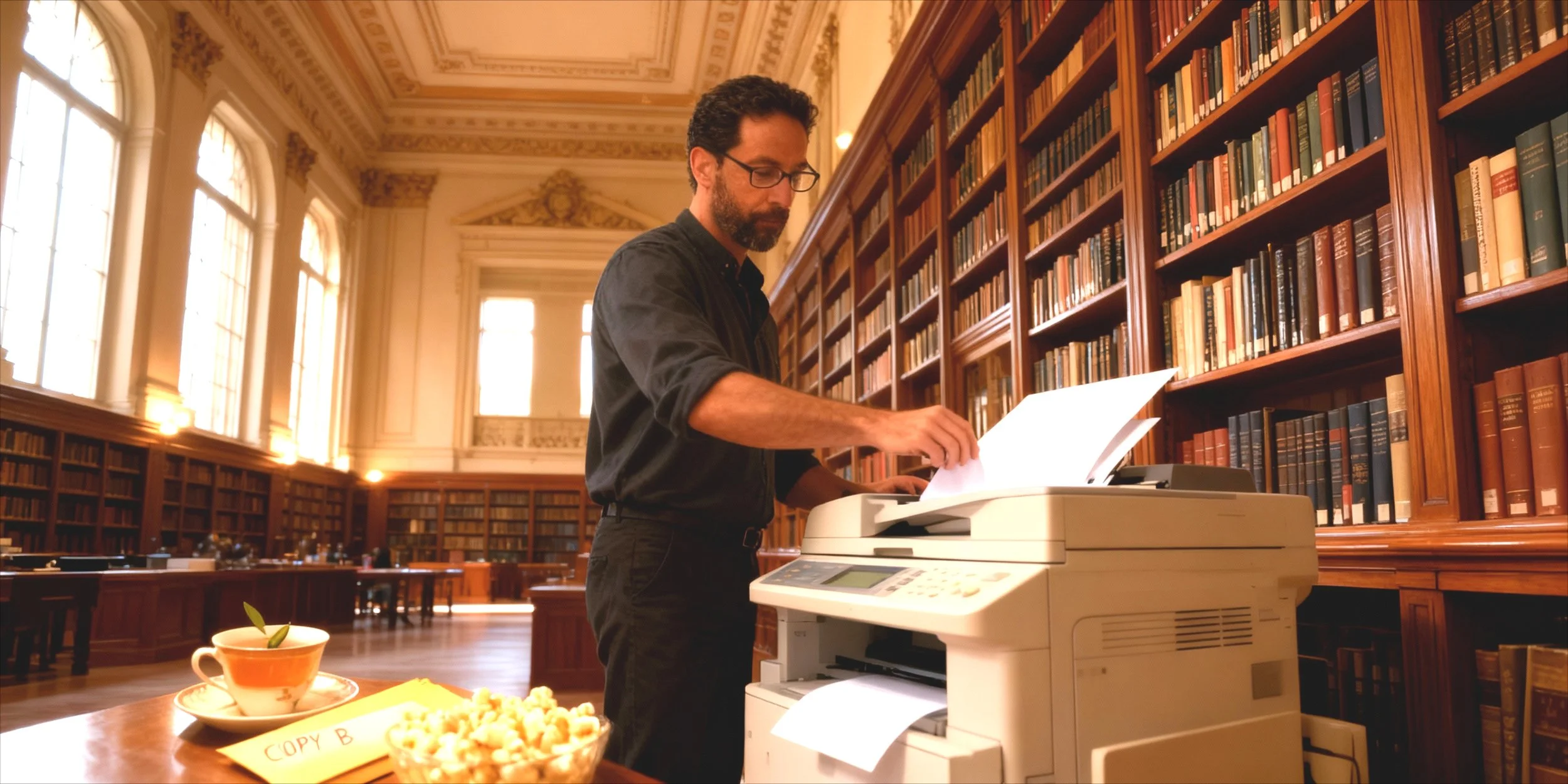 At home — small apartment, warm lamps, the smell of cardamom tea — he settles into his favorite chair with popcorn and the envelope marked COPY B.